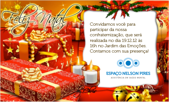 O Espaço Nelson Pires convida os seus colaboradores para participar da confraternização de Natal, que será realizada no dia 19 de dezembro, às 16h no Jardim das Emoções. Contamos com a presença de todos!